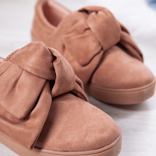 - Кросівки ковзають на плоскій підошві. Верх виконаний з рожевої замші з еко-шкіри. Підкладка - екошкіра. Представлене жіноче взуття прикрашене бантом. ПРИМІТКА: Модель може мати сліди клею на підошві!