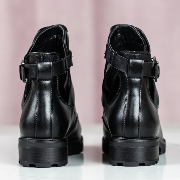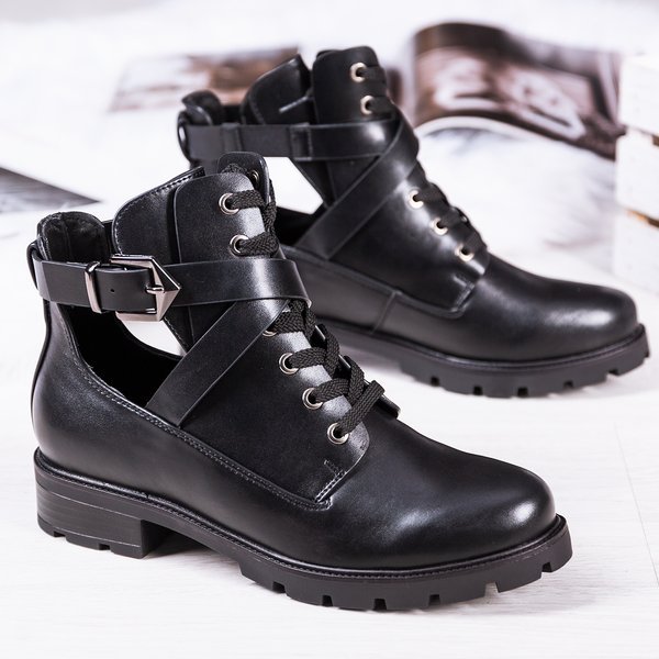 - Черевики на низьких підборах та з вирізами на халявці. Виготовлені з чорної еко-шкіри. Внутрішня частина взуття обшита тканиною. Застібаються декоративною застібкою та шнуруються. Підошва з розрізаним протектором. До повсякденного стилю.