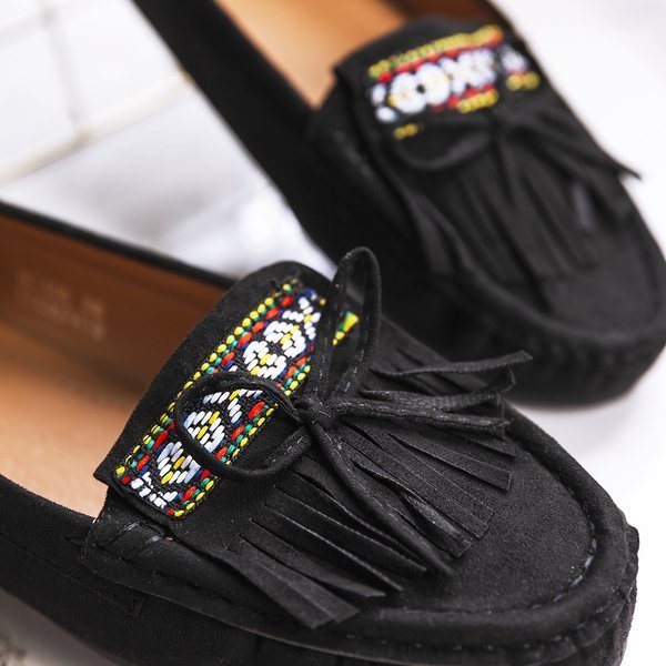 - Стильні еспадрільї з бахромою з різнокольоровою вишивкою. Верх - чорна еко-замша. Устілка взуття вкрита екошкірою. Представлене жіноче взуття - ідеальний аксесуар для літніх днів.
