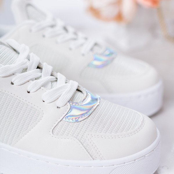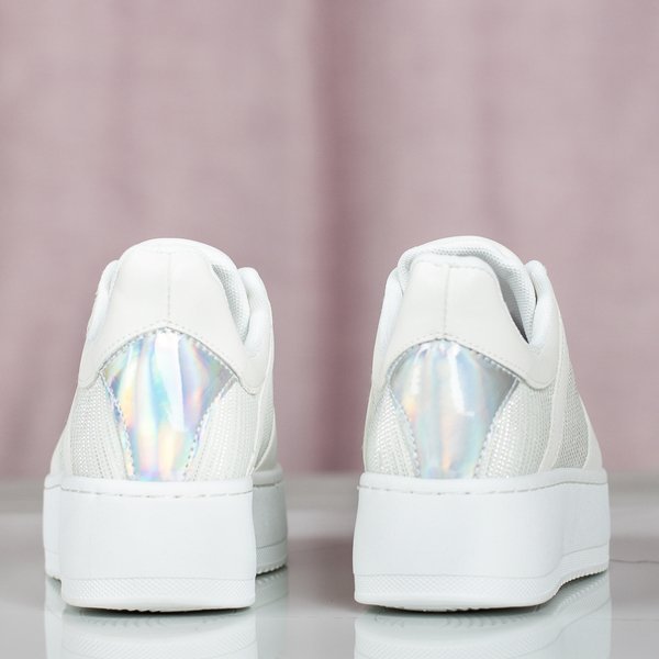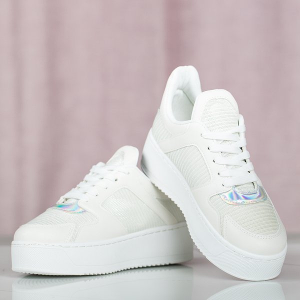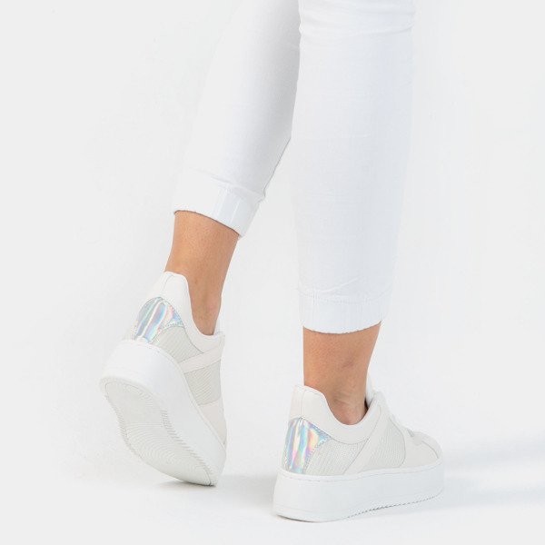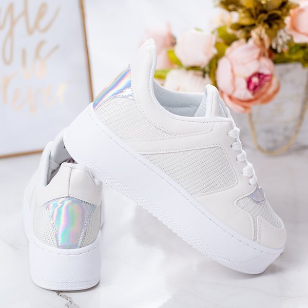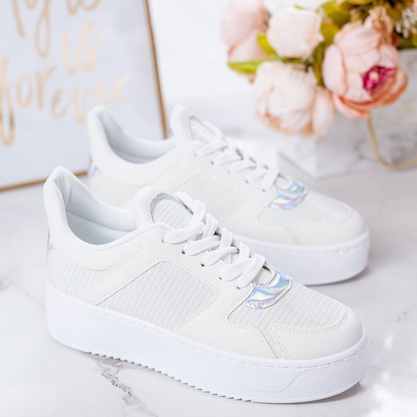 - Смачне біле спортивне взуття на платформі. Верх виконаний з поєднання еко-шкіри та тканини з блискучою ниткою. Модель має голографічні вставки. Мереживне взуття. Центр, облицьований тканиною.