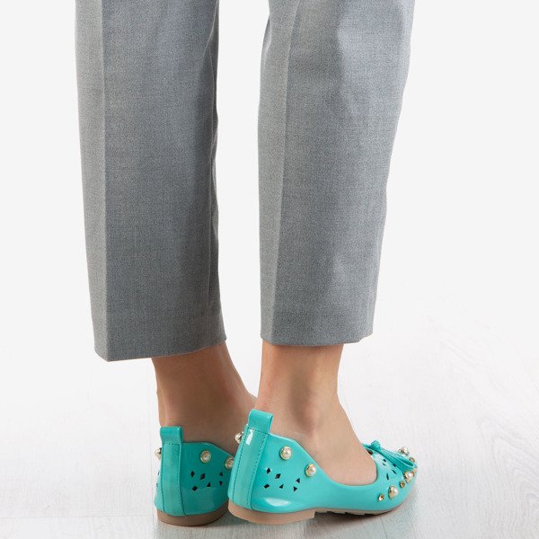 - Жіночі балетки з монетного двору з бірюзовим кольором із загостреним носком. Верхня частина має вирізи та орнаменти у вигляді фіаніту та перлів. Внутрішня частина взуття виконана з екошкіри. Представлене жіноче взуття ідеально підходить для елегантних сти