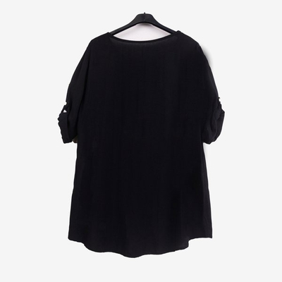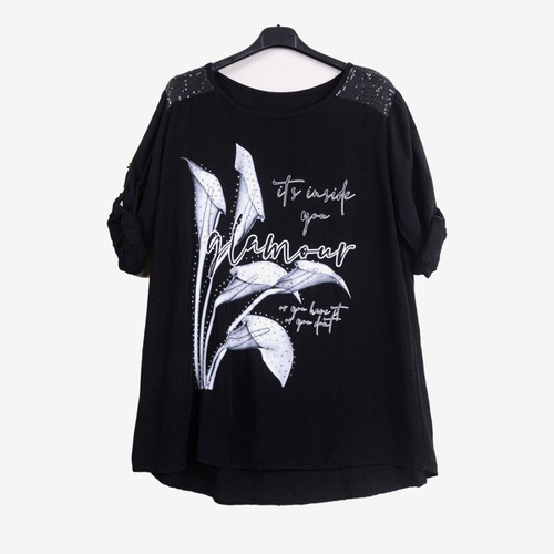 • Жіноча туніка великого розміру з віскози. Рукава мають застібку на ґудзики. Модель прикрашена квітковим принтом, написами та фіанітами. ПРИМІТКА: Точність вимірювання (+/-) 1 см.
