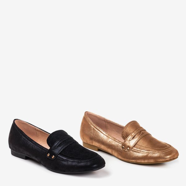 • Елегантні жіночі лофери з квадратним носком. Чорна модель з блискучим золотим покриттям. Верх і устілка виготовлені з екологічної шкіри. Еко-замшева вставка на носку. Id