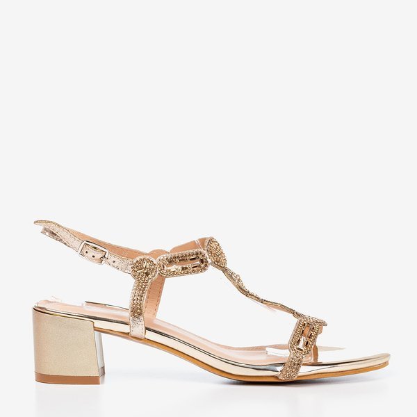 - Золоті сандалії на низькому стовпі з екошкіри. Модель, прикрашена фіанітом. Туфлі, застібаються на пряжку збоку. Ідеальне доповнення до суконь та спідниць.