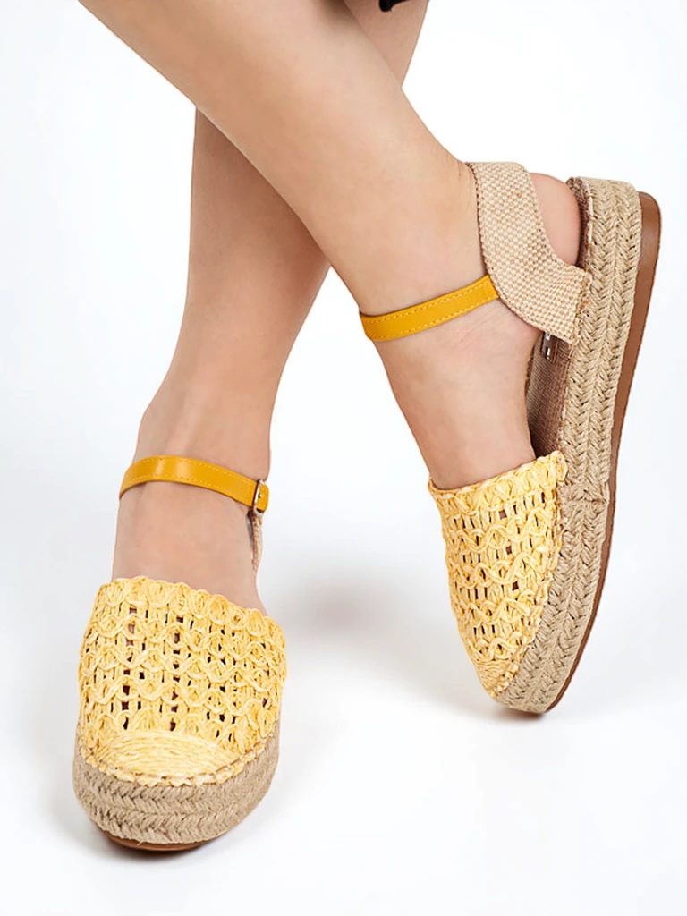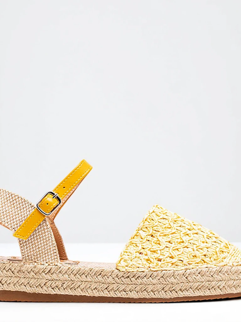 - Жовті жіночі еспадрільї на низькій платформі. Верх виготовлений із пластику. Підошва прикрашена плетеним джутовим шнуром навколо нього. Модель застібається на пряжку. Керівництво по тканині. Ідеально підходить для літа.