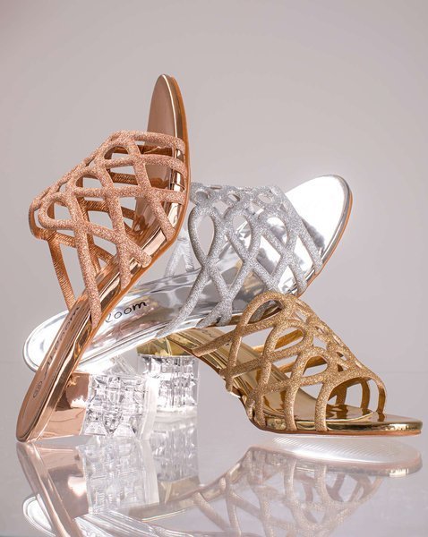 - Дивовижні жіночі тапочки на вищому прозорому каблуці. Виготовлений з еко-шкіри, покритий блиском. Верх має вирізи. Вставка виконана з пластику. Ідеально підходить для коктейльних суконь.