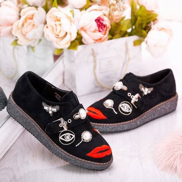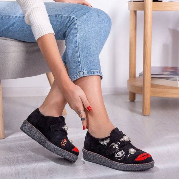 - Елегантні чорні жіночі туфлі на платформі з екологічної замшевої шкіри. Модель кріпиться застібкою. Декоративні пластирі, стрази та перли на верху. Устілка з еко-шкіри. Підошва покрита парчею.