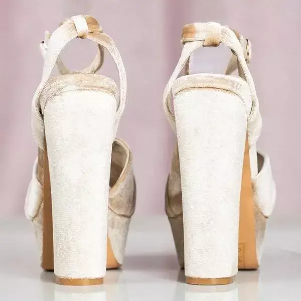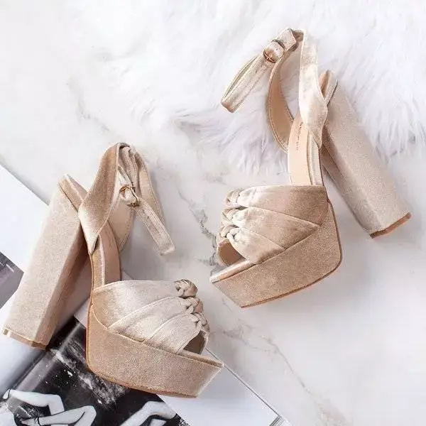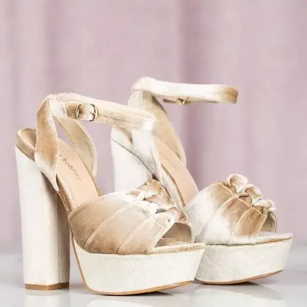 - Бежеві босоніжки на високих підборах з велюрового матеріалу. Бордова кольорова модель. Жіноче взуття застібається пряжкою на щиколотку. Ідеальне взуття для теплих днів. Примітка: виріб має сліди клею на матеріалі.