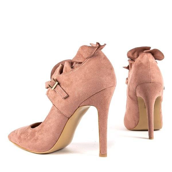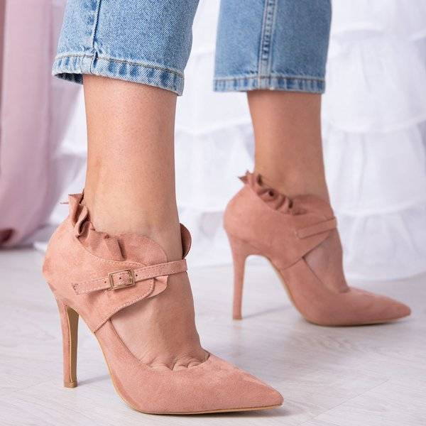 - Елегантні туфлі на високій шпильці, рожевого кольору. Матеріал виготовлений з м'якої екологічної замші, а устілка покрита екологічною шкірою. Верхній крах халявки прикрашений рюшами. Загострений носик, оптично видовжує ноги. Закриваються пряжкою.