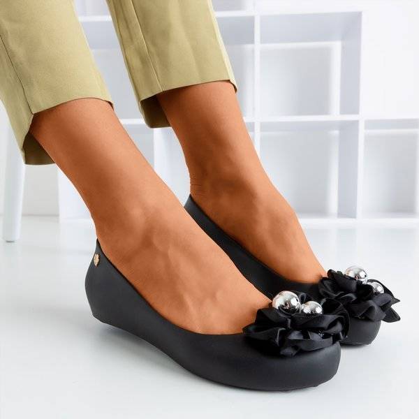 • Балерина чорна меліса на закритому клині. Взуття зроблена з гуми, устілка - з пластика. Балерини прикрашені квітами зі срібними перлами. Взуття має шапку на носках. Зручне повсякденне взуття.