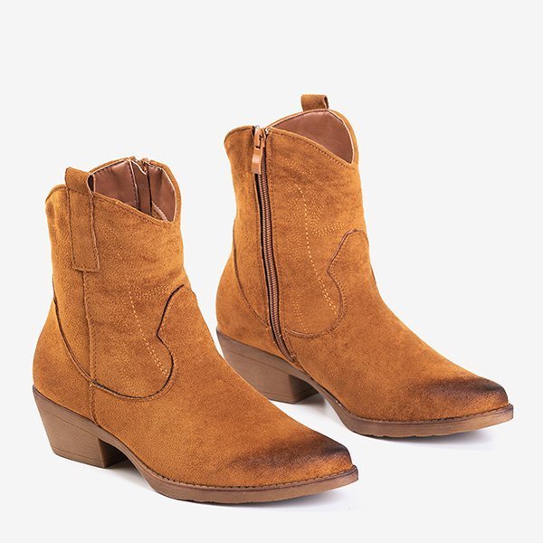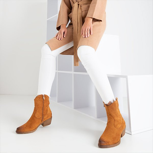 - Модні черевики на плоскому підборі а-ла-ковбойські черевики, виготовлені з еко-замшевої шкіри коричневого кольору. Модель утеплена м’яким хутром. Взуття застібається на блискавку збоку, загострений носок. Ідеально підходить для повсякденного гардеробу!