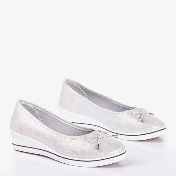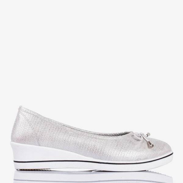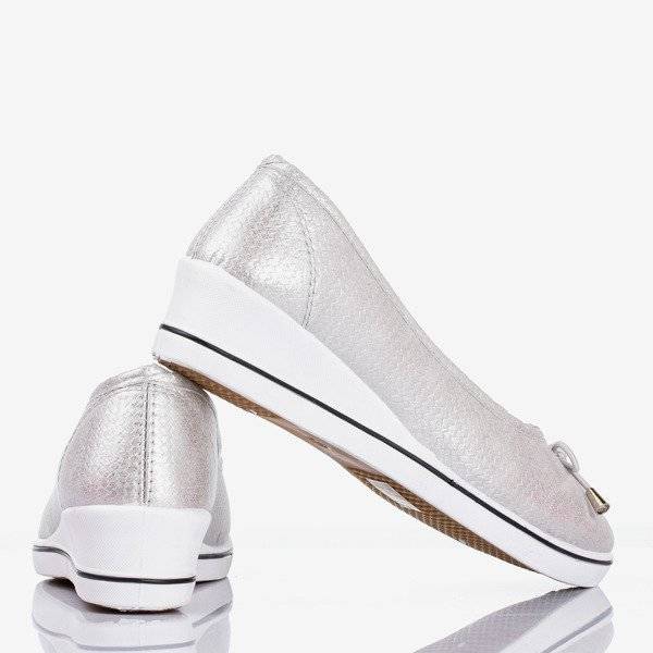 - Жіночі балетки на низькому клині в сріблі. Верх зроблений з глянцевого матеріалу, що нагадує шкіру. Твердо виготовлена та дуже зручна завдяки м’якій гумовій підошві.