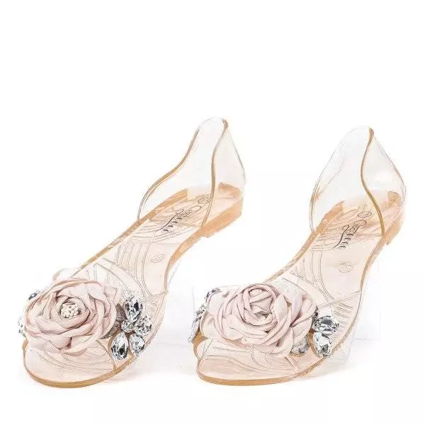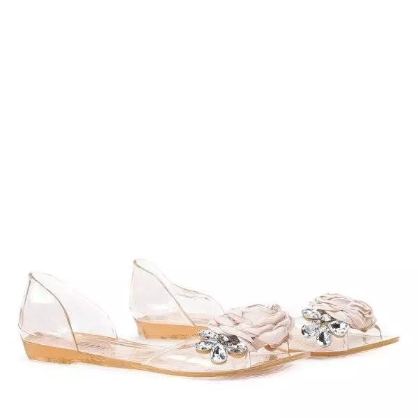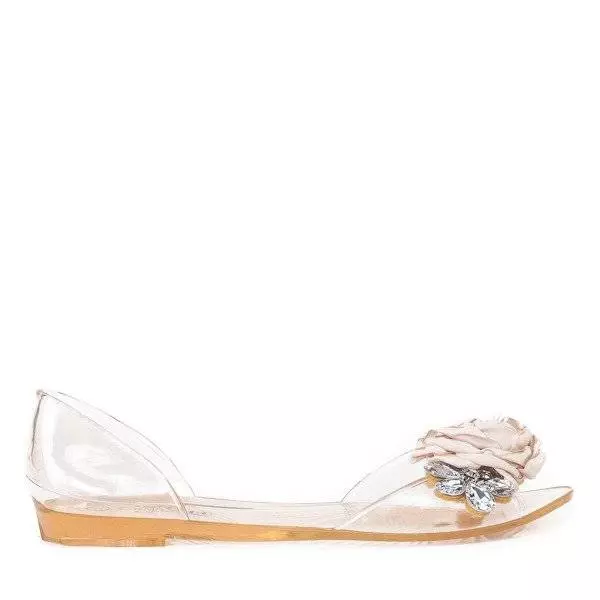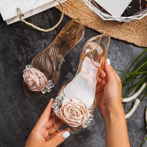 • Бежеві прозорі балерини типу Меліски з гумового матеріалу. Взуття прикрашене красивими камінчиками і великою тканинною квіткою. Примітка: виріб має сліди клею на матеріалі.