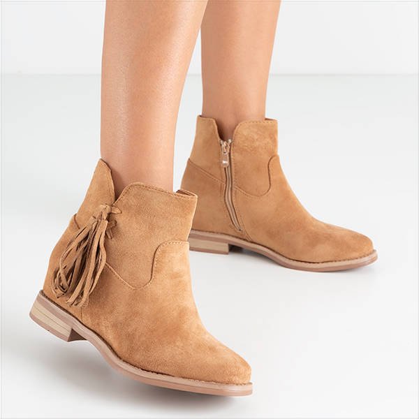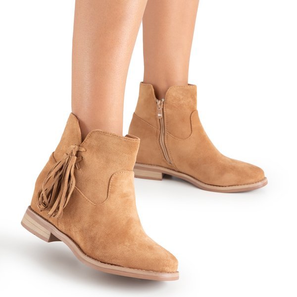 - Унікальні жіночі черевики на прихованій танкетці, виготовлені з еко-замшевої шкіри світло-коричневого кольору. Верх з зовнішньої сторони прикрашений бахромою. Модель застібається на блискавку збоку. Ідеально підходить для осінніх стилізацій!