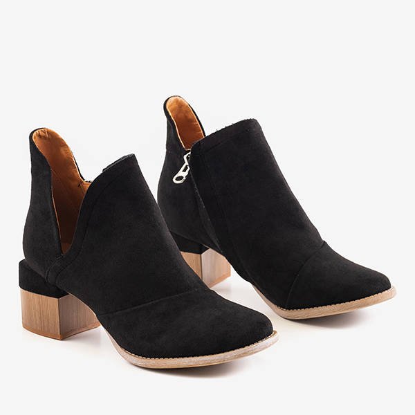 • Модні жіночі ботильйони з вирізами на низьких підборах. Верх виконаний з еко-замші чорного кольору, а устілка покрита тканиною. Модель застібається на блискавку з внутрішньої сторони. Ідеально поєднуються з будь-яким повсякденним стилем!