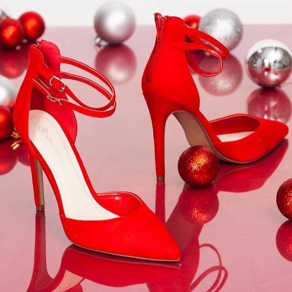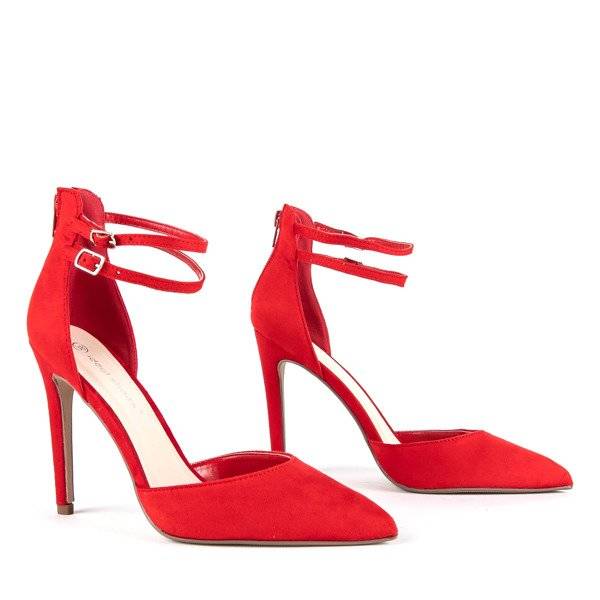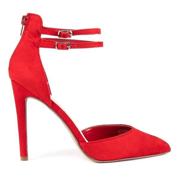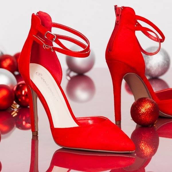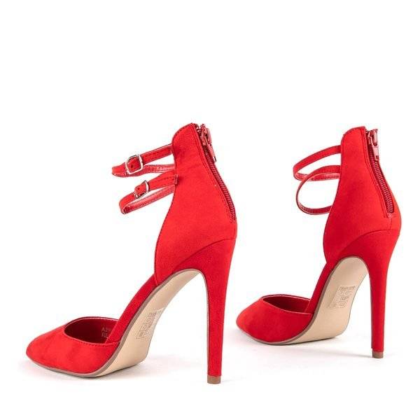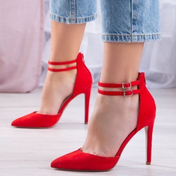 - Надзвичайно елегантні насоси на високому каблуці. Верх виконаний з екологічної червоної замші. Ніс наконечник, що візуально струсить ноги. У них є застібка та застібка на блискавку.