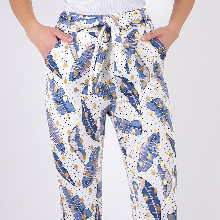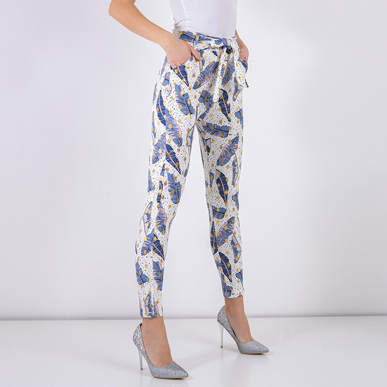 - Стильні жіночі штани з еластичної тканини. Модель має еластичний пояс, дві кишені-сліпи та ремінь відповідного кольору. Штани оздоблені принтом у вигляді пір'я. Ідеально пасуватимуть для Вашої сорочки! ПРИМІТКА: Точність вимірювання (+/-) 1 см.