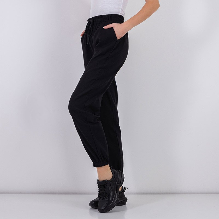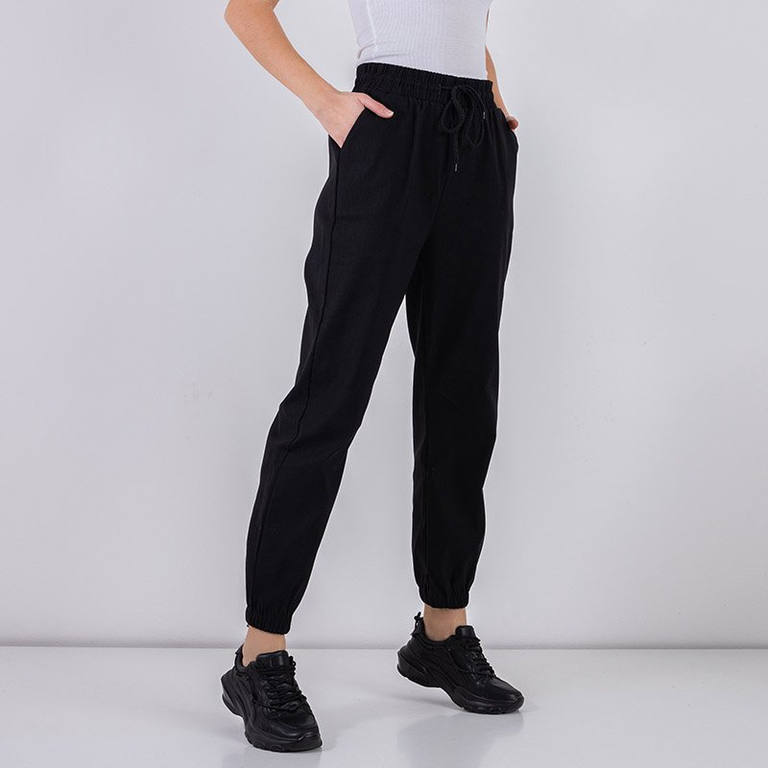 - Стильні штани типу карго виконані з еластичної тканини. Модель з еластичним поясом на зав'язках, спереду дві накладні кишені, а також еластичні резинки внизу штанин. ПРИМІТКА: Точність вимірювання (+/-) 1 см.