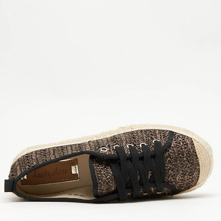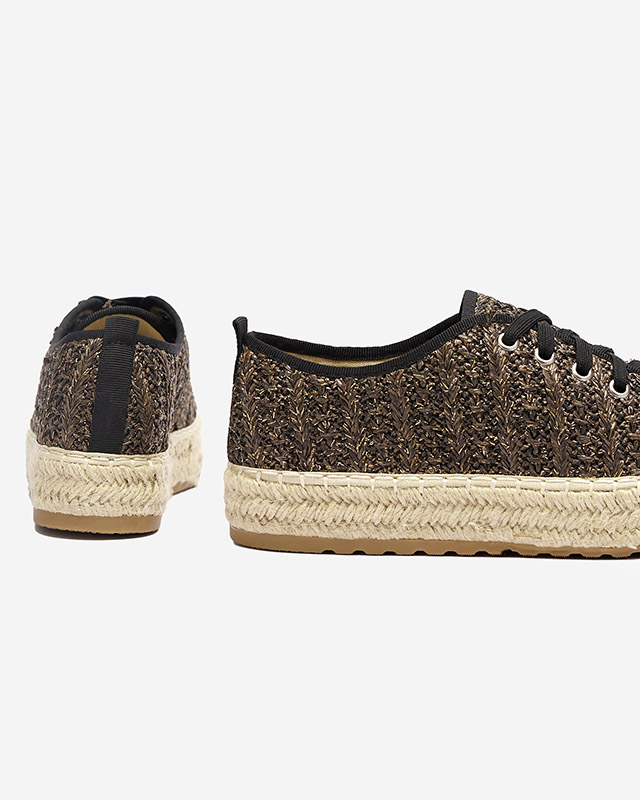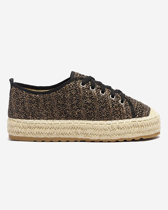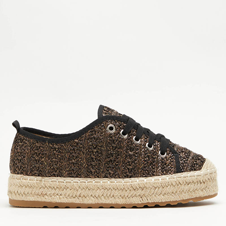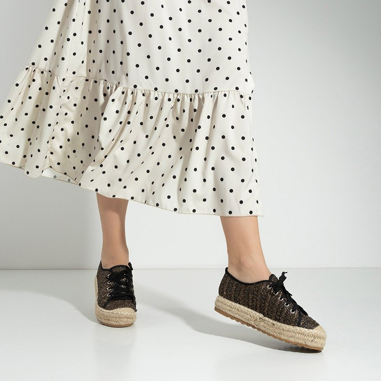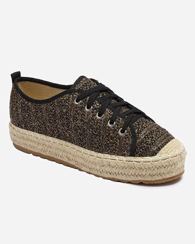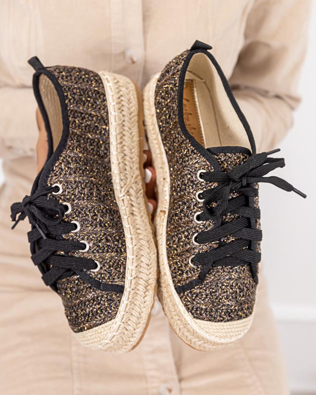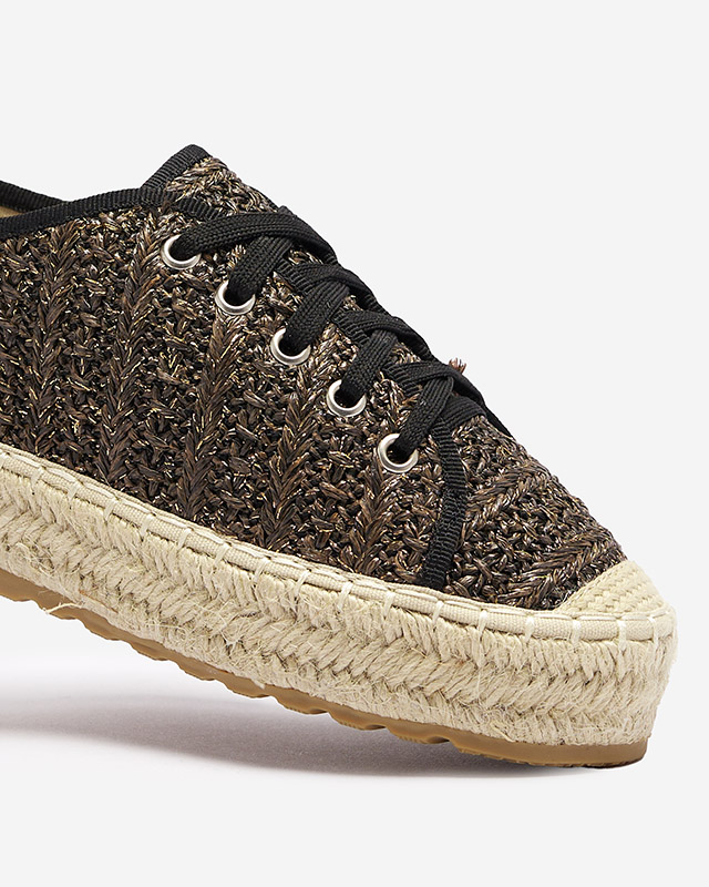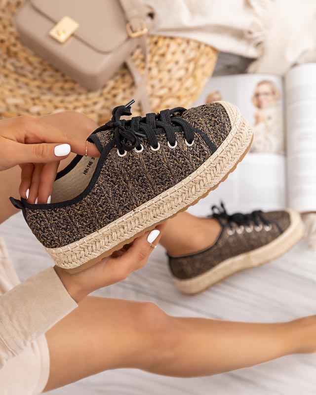 - Стильні жіночі еспадрильї з тканої соломи, оброблені золотою ниткою. Устілка підшита тканиною. Модель на низькій платформі, прикрашена джутовою ниткою. Ідеально підходить для щоденних образів.