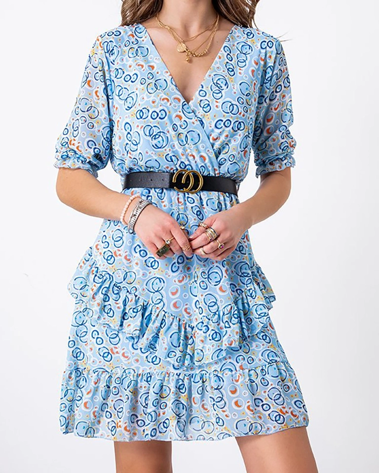 - Стильна жіноча сукня, довжини міні. Виготовлена з легкої тканини з квітковим візерунками. Модель з декольте на запах і розкльошеним низом, прикрашеним оборками. Рукава довжиною 3/4. Ремінь у комплекті.