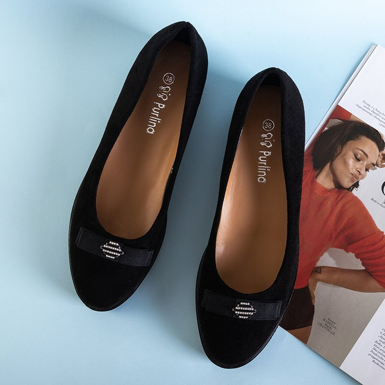 - Класичні жіночі балетки на плоскій підошві. Виготовлені з екологічної замшевої шкіри. На носку модель оздоблена вставкою з еко-шкіри та бантом. Зручне взуття на щодень.