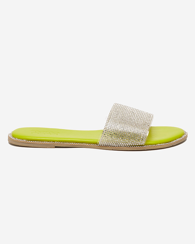 - Жіночі шльопанці, прикрашені стразами. Ремінець виготовлений з пластику, устілка - з екологічної шкіри.