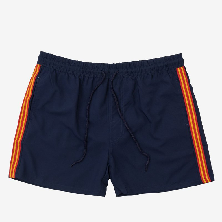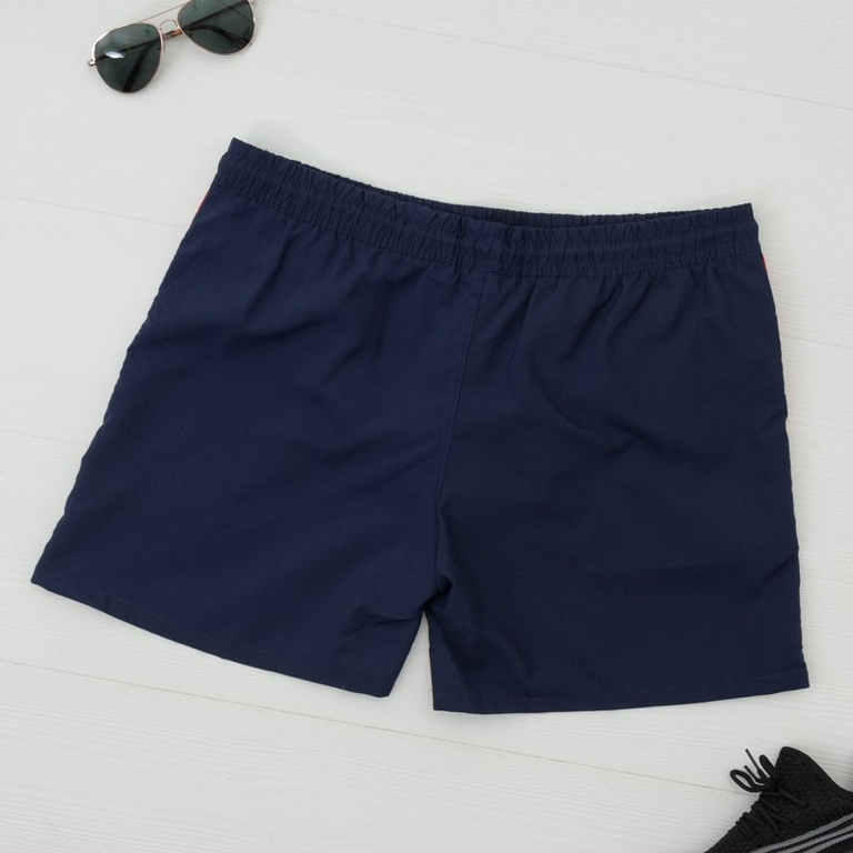 - Чоловічі короткі шорти з еластичного матеріалу. Модель має 2 кишені, еластичну резинку в поясі на зав'язках, а також сітку всередині. По боках шорти оздоблені лампасами.