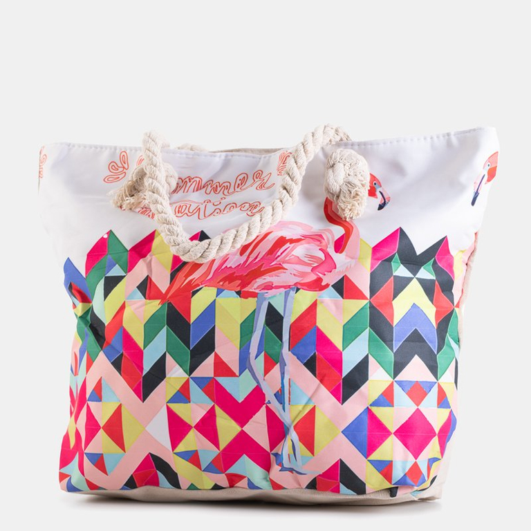 - Яскрава сумка з тканинного матеріалу, прикрашена візерунками та принтом у вигляді фламінго. Модель застібається на блискавку, всередині велике відділення, яке розділене перегородкою. Ідеально підходить для пляжу!