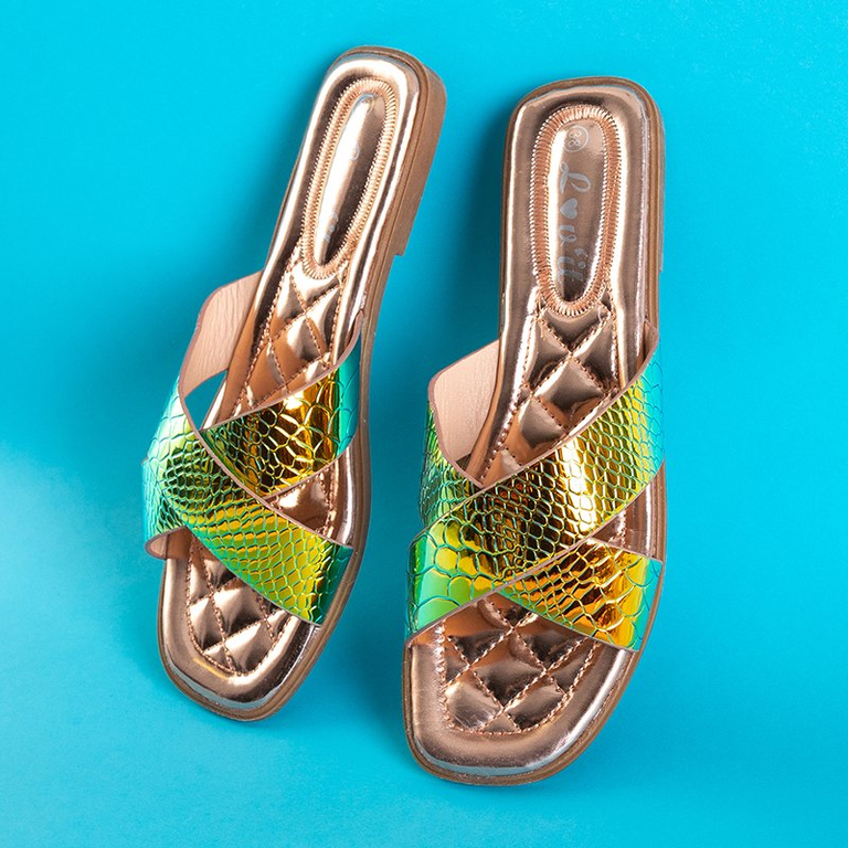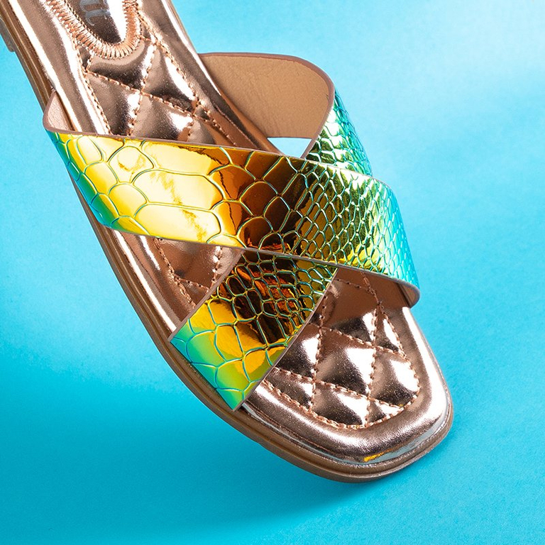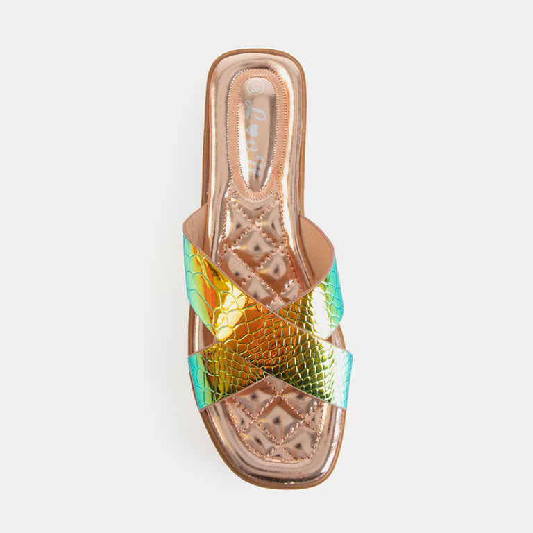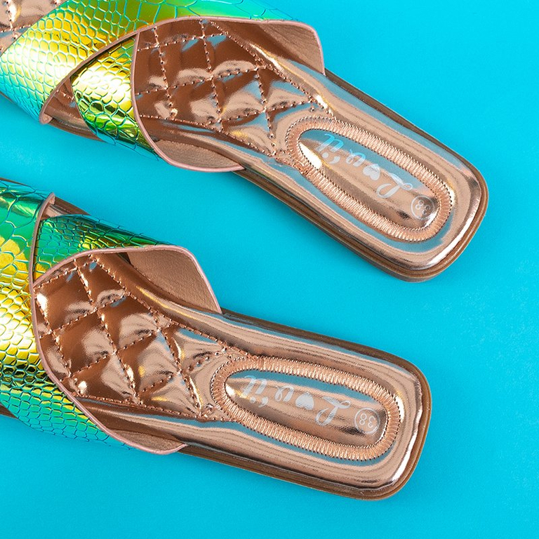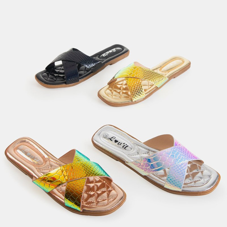- Фантастичні жіночі шльопанці з квадратним носком. Ремінці виготовлені з лакованої екошкіри та оздоблені текстурою під шкіру крокодила. Устілка обшита екошкірою зі стьобаним ефектом. Ідеальне взуття для літнього образу!