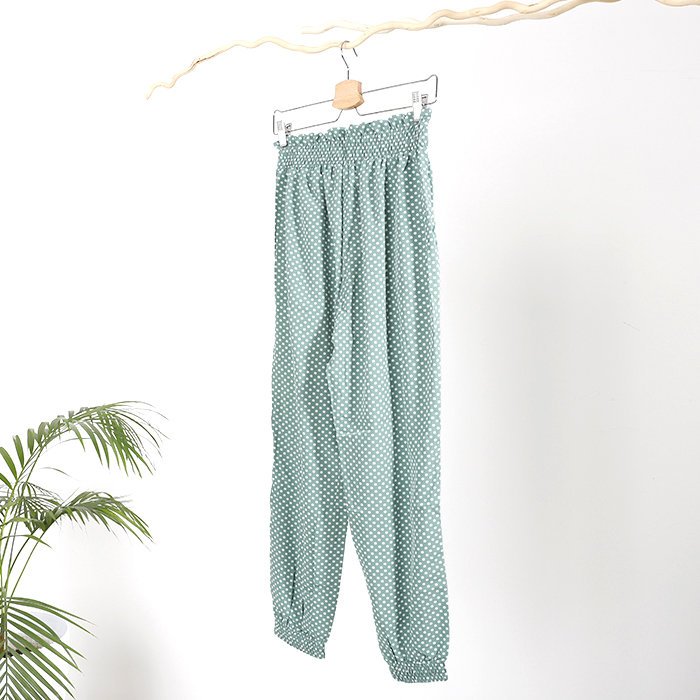 - Жіночі легкі штани в горошок. Виконані з тканини з високим вмістом бавовни. Модель має еластичну резинку в поясі, декоративні зав'язки та 2 кишені.