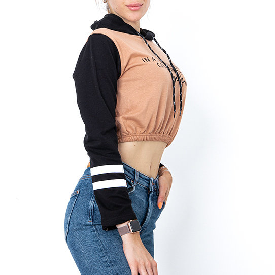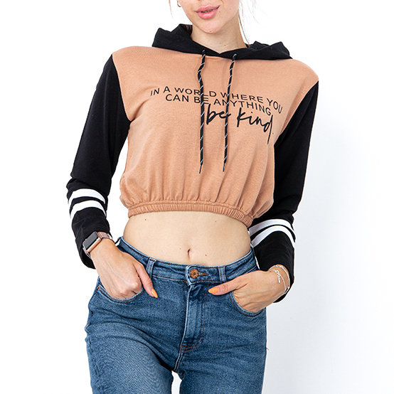 - Укорочене жіноче худі з написами. Виконане з віскози. Модель має капюшон та еластичний низ з резинкою. Ідеально підходить для створення модних та оригінальних образів!