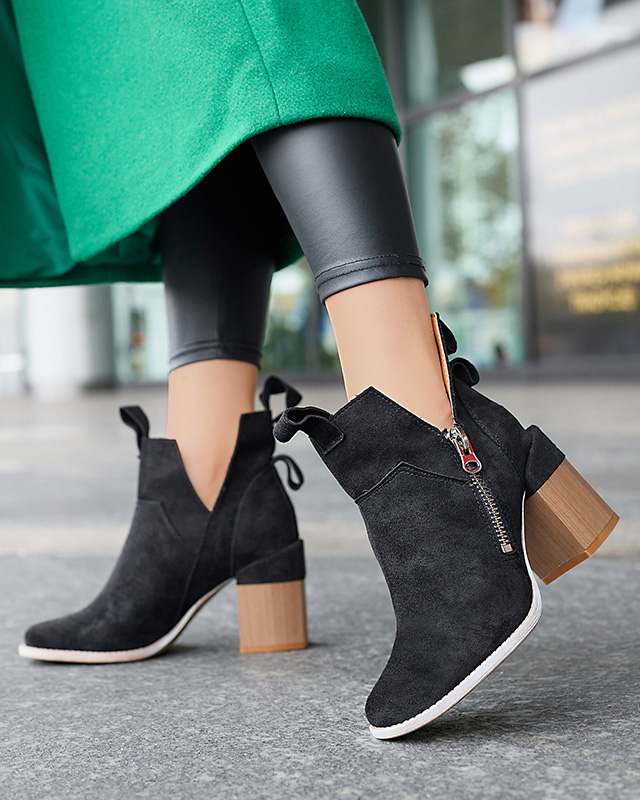 • Стильні жіночі ботильйони на квадратних підборах з круглим носком. Матеріал виготовлений з екозамші, всередині устілка з екошкіри. Верх на блискавці, збоку декоративні вирізи. Ідеальне взуття для створення модного та оригінального образу!