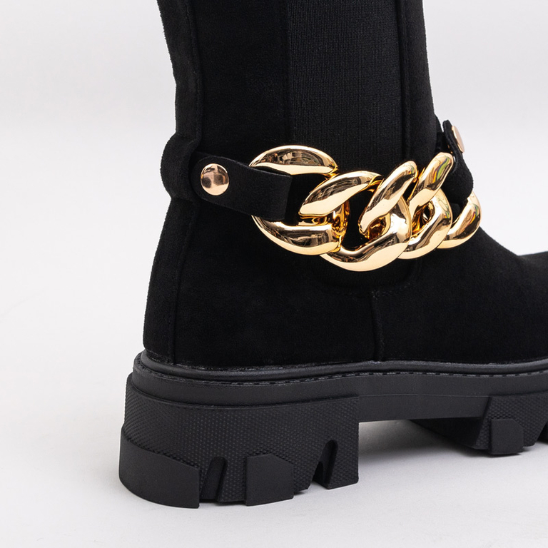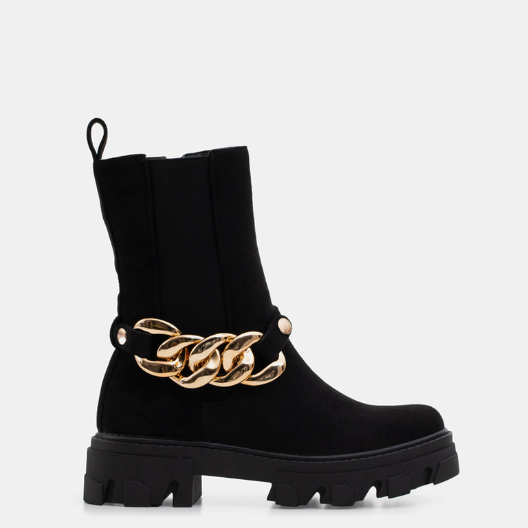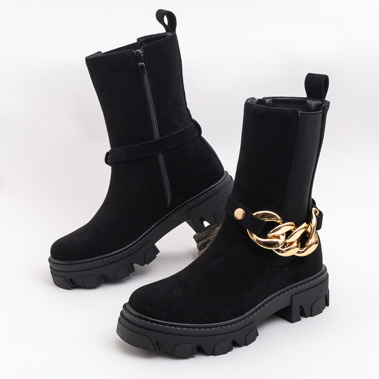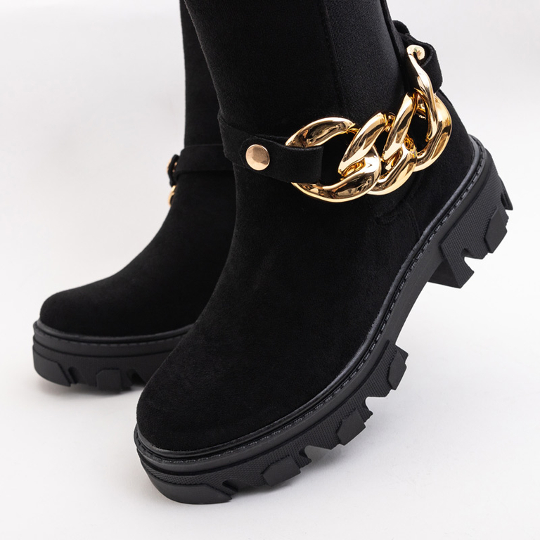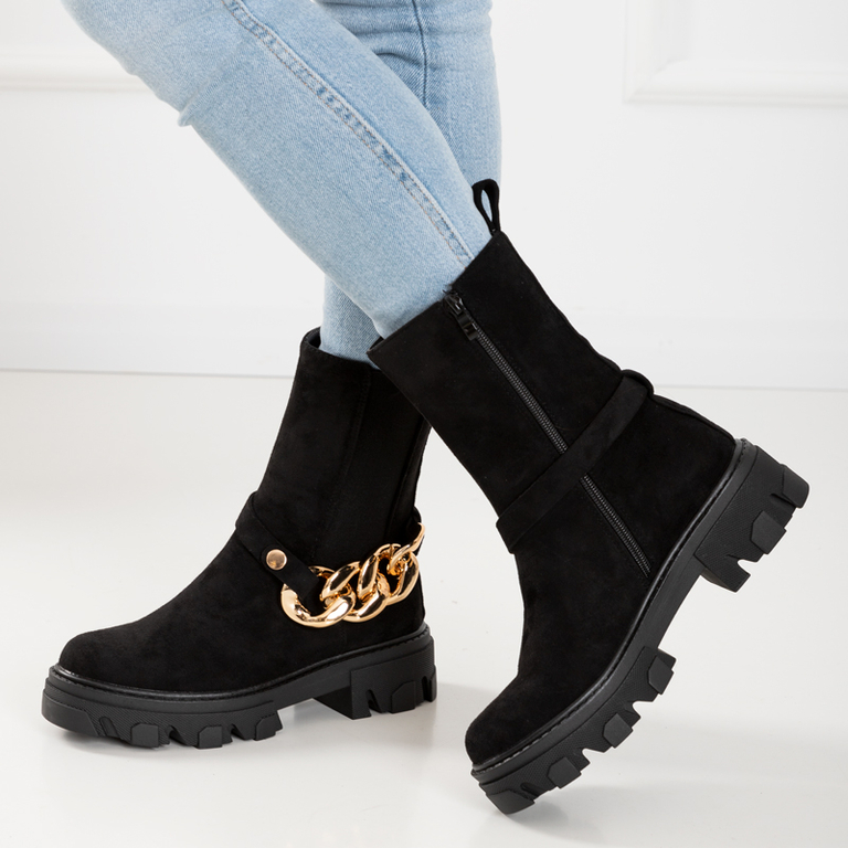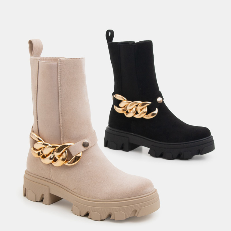 • Модні жіночі черевики на тракторній підошві. Всередині вони мають делікатне утеплення. Модель застібається на блискавку та прикрашена ремінцем із золотистим масивним ланцюгом.