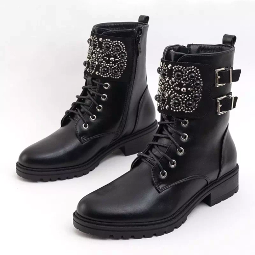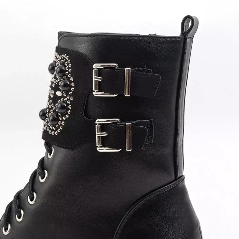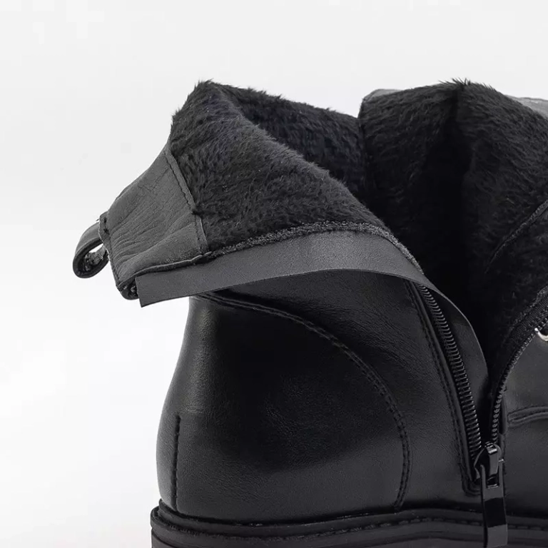 - Зимове жіноче взуття на плоских підборах, застібається на блискавку. Передня модель має декоративний ремінь, пристебнутий пряжками. Взуття з екологічної шкіри, всередині утеплювач. Примітка: на виробі є подряпини на матеріалі.