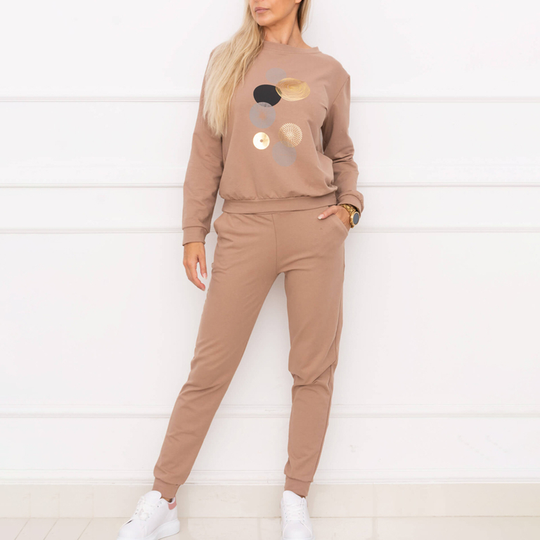 • Стильний жіночий спортивний костюм - штани та світшот. Модель виготовлена з приємної на дотик бавовни. Светр оздоблений принтом спереду, штани з еластичною резинкою в поясі та внизу штанин та з двома кишенями.