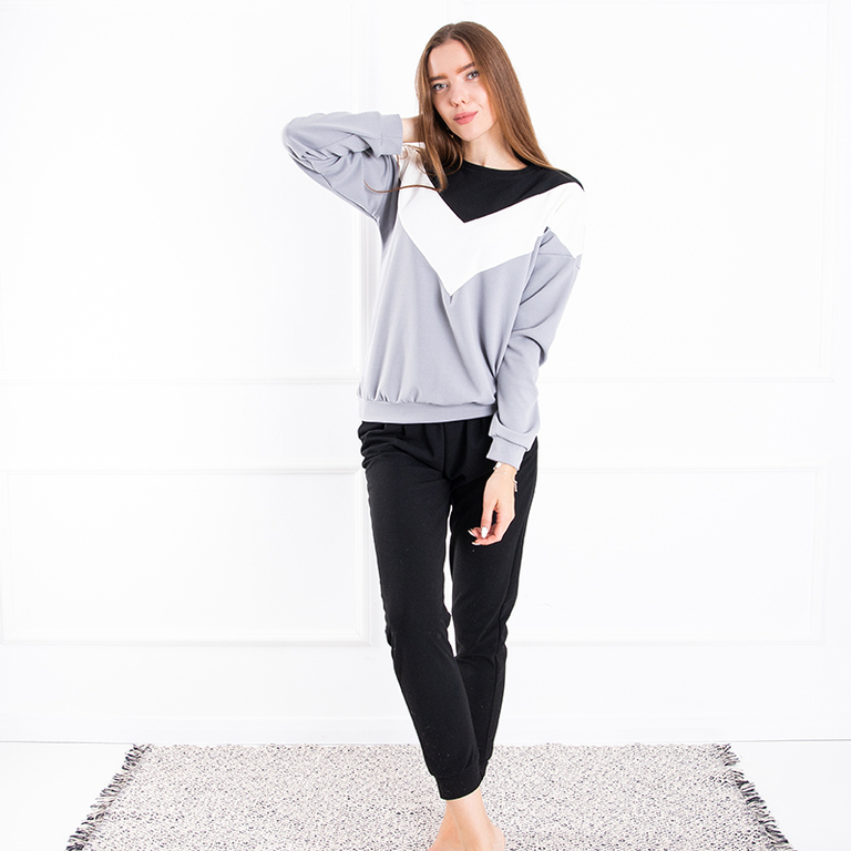 - Неперевершений жіночий костюм - світшот та штани. Світшот виконаний з поєднання трьох кольорів, штани мають еластичну резинку в поясі й 2 кишені. Комфортний варіант на щодень!