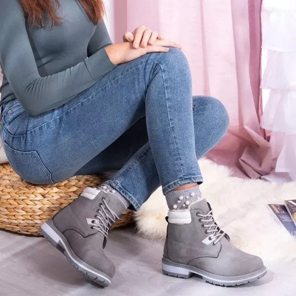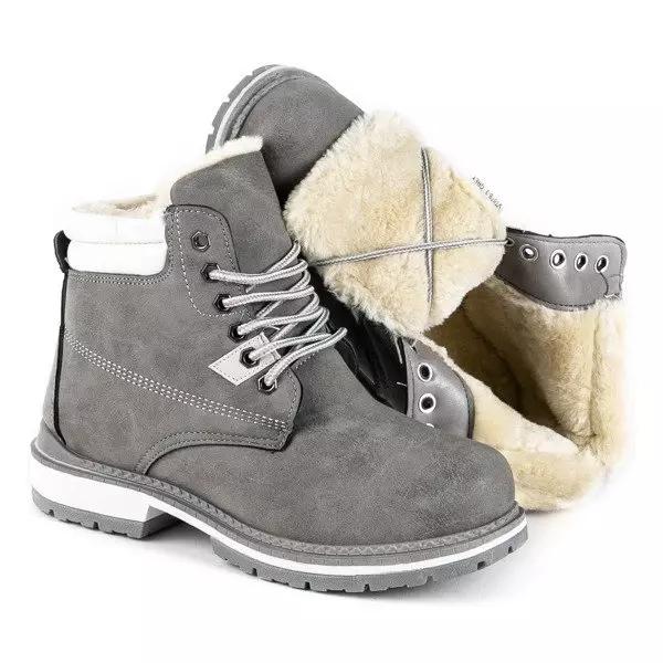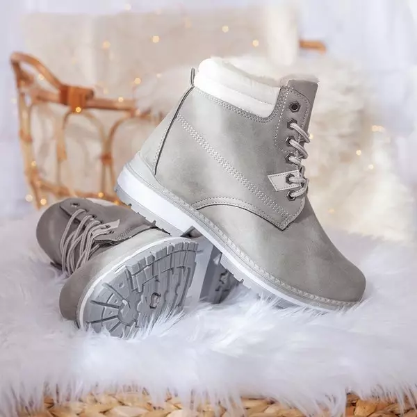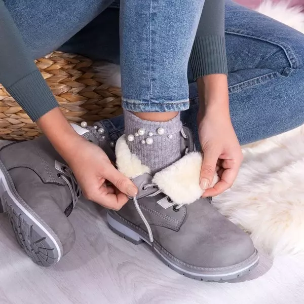 - Теплі черевики на шнурівці з вирізаним протектором. Матеріал виготовлений з матової екошкіри сірого кольору. Взуття утеплене приємним на дотик хутром. Примітка: матеріал змінив колір.