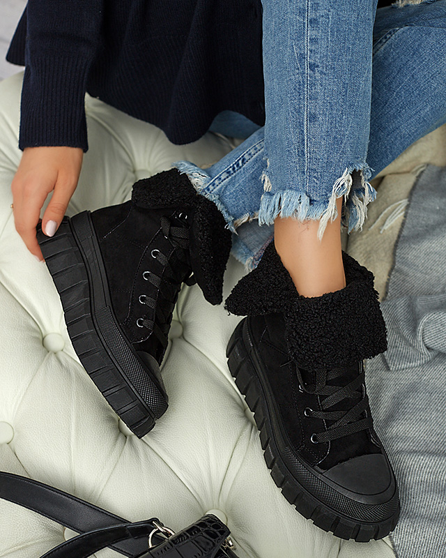 - Жіночі черевики з екологічної замші. Модель на шнурівці, утеплена теплим, м’яким матеріалом, у верхній частині – кожушок. Ідеальне взуття для холодних днів!
