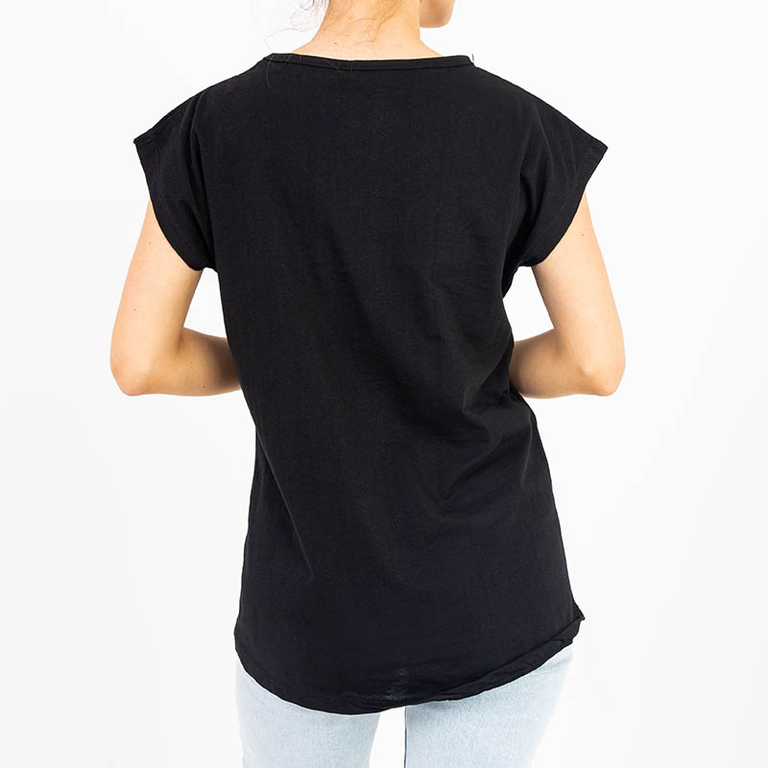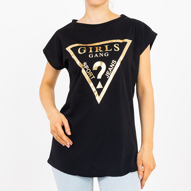 - Суперстильна жіноча футболка з короткими рукавами і круглою шиєю. Передня частина футболки прикрашена золотистим принтом. Ідеальна основа для багатьох повсякденних образів! ПРИМІТКА: Точність вимірювання (+/-) 1 см.
