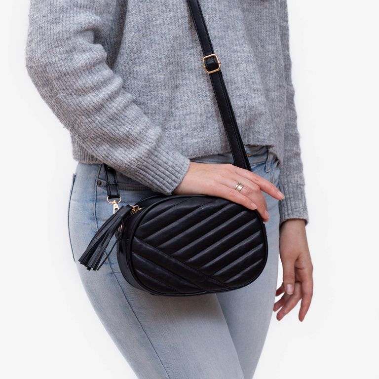 • Класична жіноча сумка. Виконана з екологічної шкіри зі стьобаним покриттям. Модель прикрашена бахромою, всередині є одна відкрита кишеня та одна кишеня на блискавці. Знімний ремінь з можливістю регулювання.