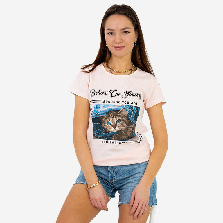 • Чарівна жіноча футболка з короткими рукавами і круглим вирізом. Спереду модель прикрашена принтом із зображенням кошеня, написами та блискітками. Ідеальний вибір для джинсів та шортів!