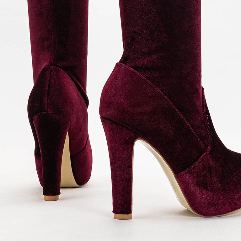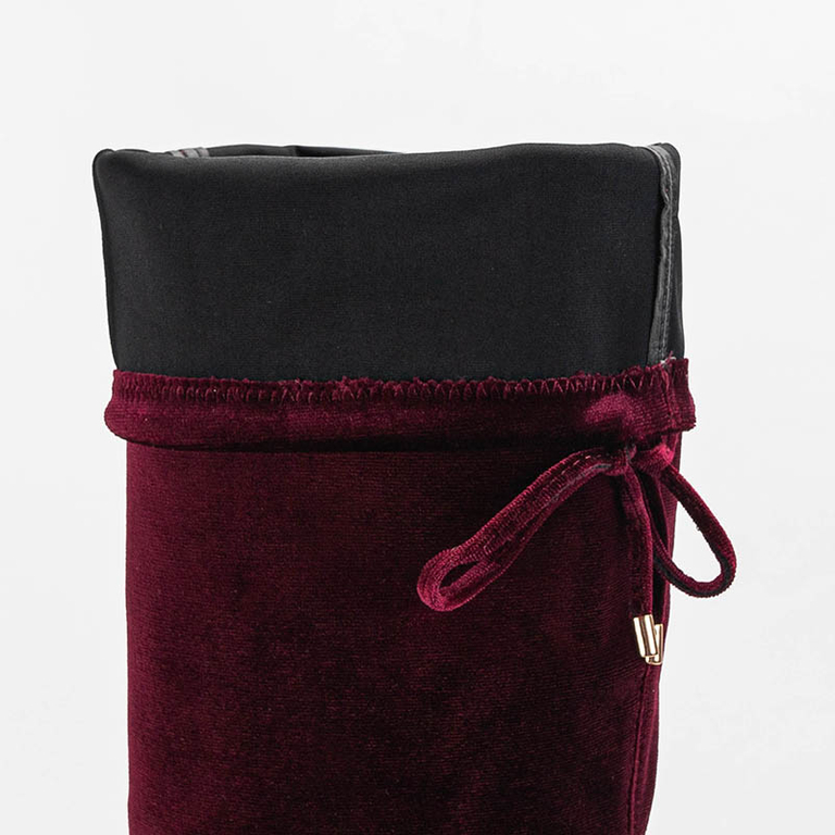 - Стильні чоботи на високому каблуці за коліно з круглим носком. Виготовлені із велюру, мають зав'язку, що стягується у верхній частині халяви. Ідеально підходять для елегантних вечірніх виходів!