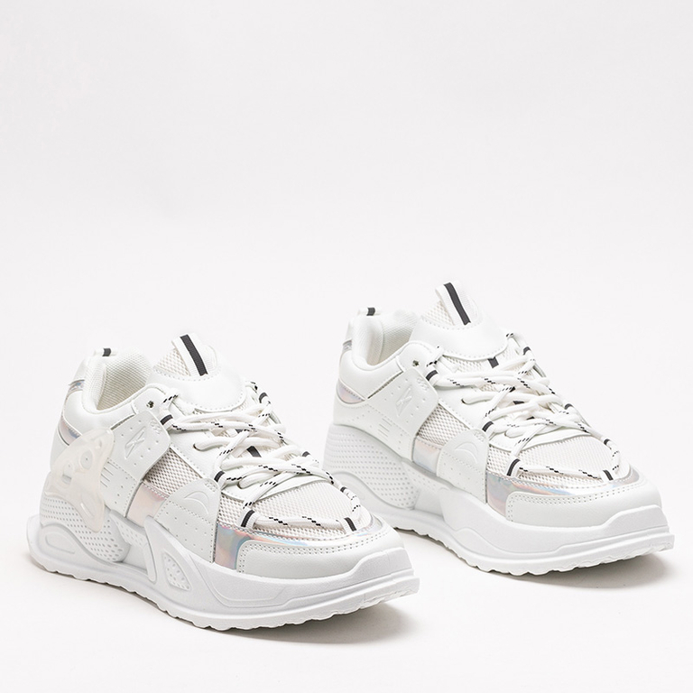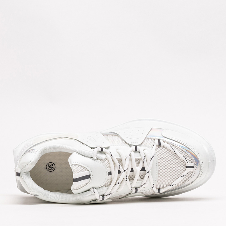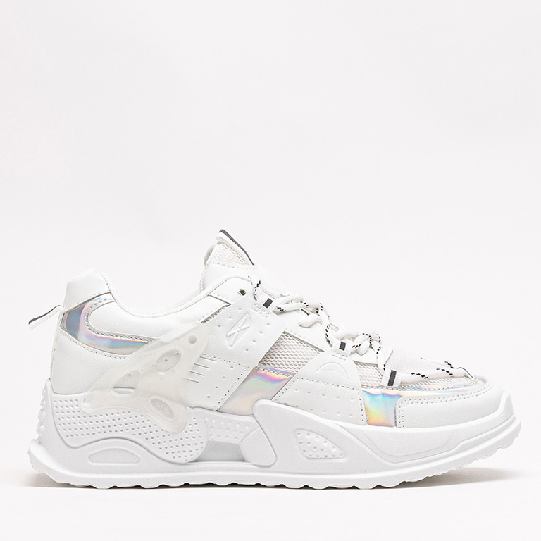 • Стильні жіночі кросівки виконані з комбінації екошкіри та тканини. Зав'язується на шнурівку, модель із голографічними вставками на гумовій підошві.