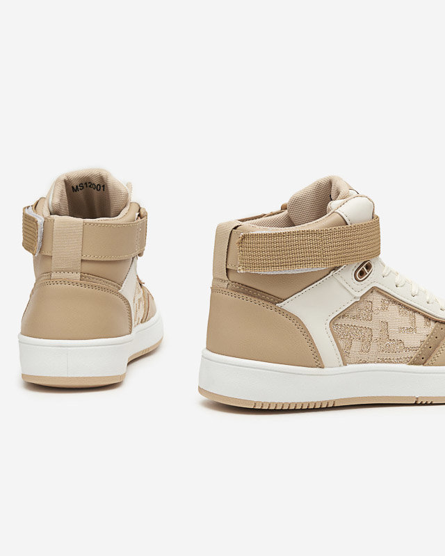 - Сучасні жіночі високі кросівки на шнурівці. Модель виготовлена з екологічної шкіри та має вставки з блискітками, устілка з тканини. Виріб шнурується і застібається на липучку на висоті щиколотки.