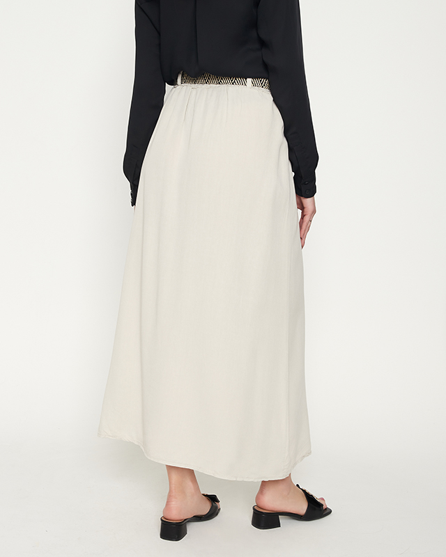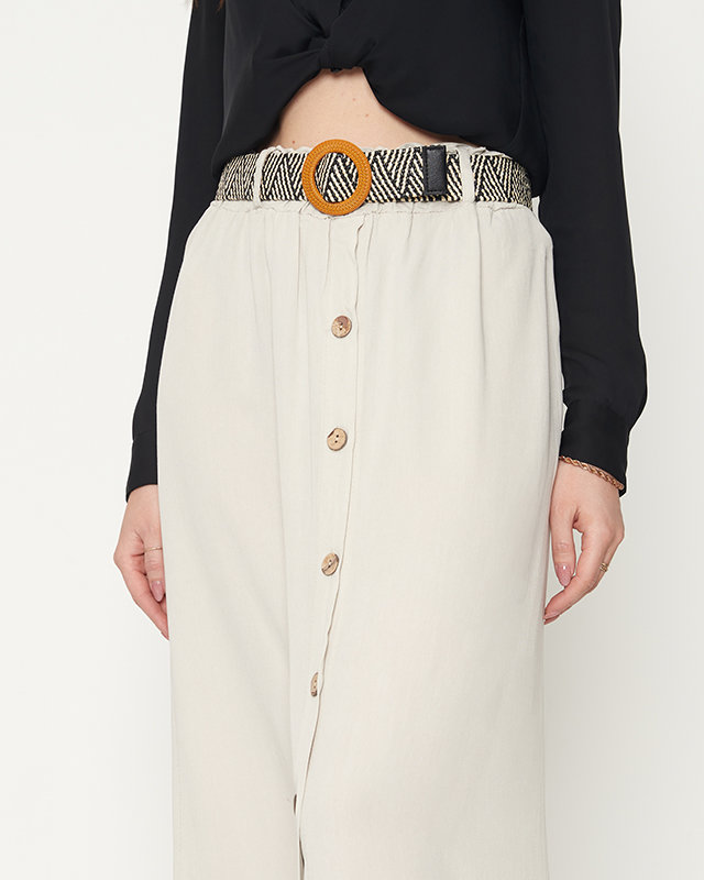 • Жіноча спідниця довжини міді. Виконана з приємного бавовняного матеріалу. В поясі еластична резинка та плетений ремінь. Модель застібається на ґудзики.