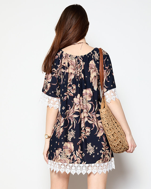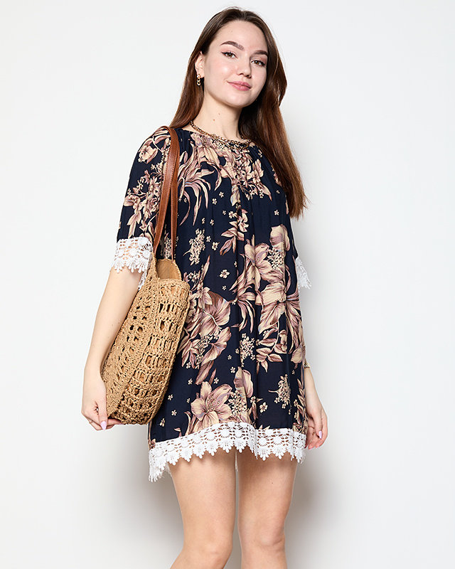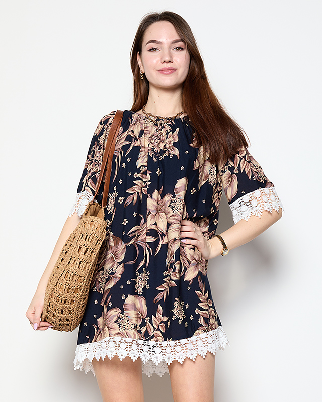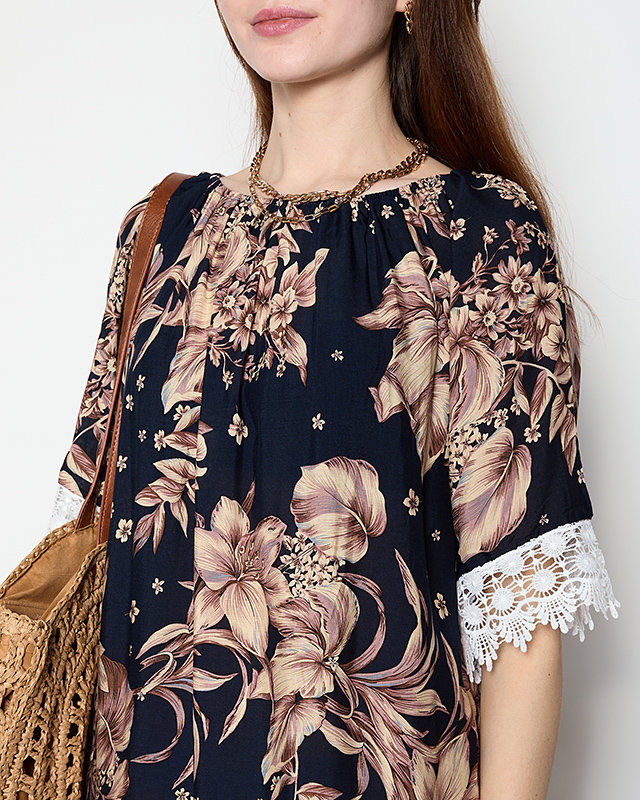 • Жіноча блузка з короткими рукавами. Виготовлена з легкого матеріалу. Модель прикрашена квітковим принтом, рукави та нижня частина блузки оброблена мереживом. Ідеально підходить для літа! ПРИМІТКА: Точність вимірювання (+/-) 1 см.