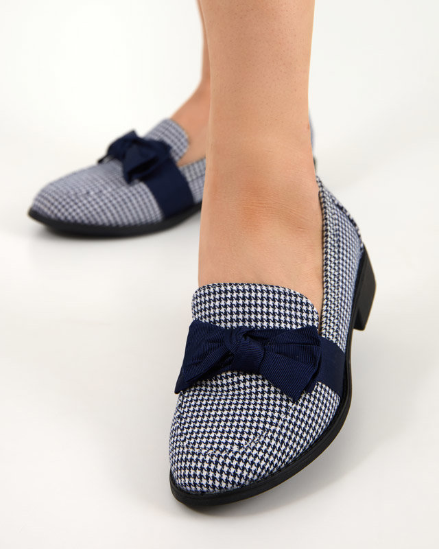 - Незвичайні жіночі лофери з візерунком «гусині лапки» та бантом на носі. Верх виготовлений з тканини, а устілка - з екошкіри.