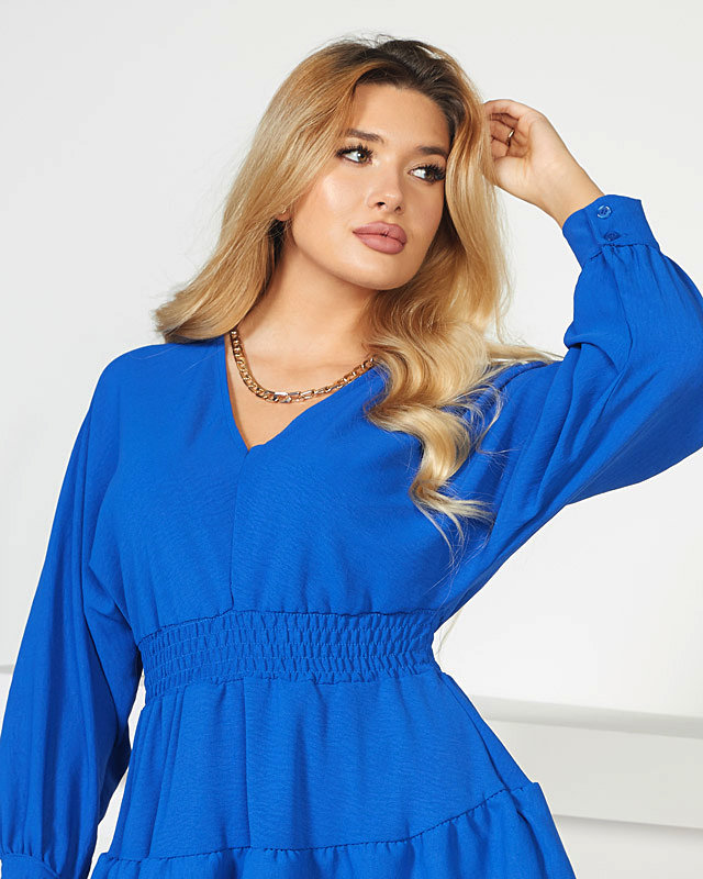 - Мила жіноча сукня, виготовлена з м'якої, повітряної тканини. Виріб з V-подібним вирізом, довгими рукавами на гудзиках і широкою еластичною резинкою на талії, що підкреслює фігуру. Низ сукні оздоблений оборками. Точність вимірювання (+/-) 1 см.