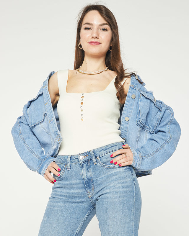 - Жіночий топ на бретелях з еластичного матеріалу з прямокутним вирізом. На лицьовій стороні — орнамент із цирконів та вирізів. ПРИМІТКА: Точність вимірювання (+/-) 1 см.