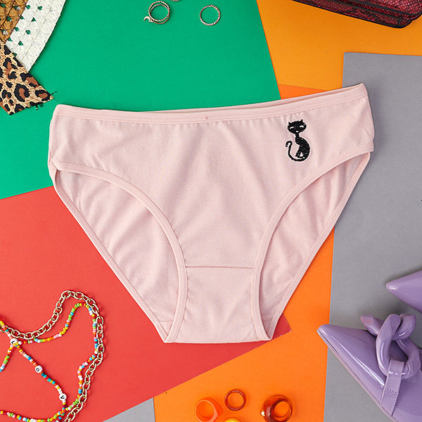 Світло-рожеві бавовняні жіночі труси з вишитим котом - Нижня білизна
